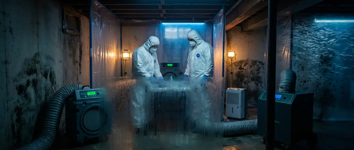 We construct airtight microbial containment chambers utilising 6-mil poly-sheeting and zipper-doors, keeping active mould spores isolated from healthy, unaffected areas of the home.